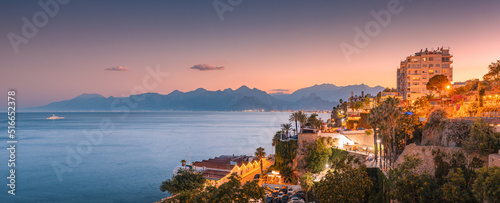 © EdNurg, Fototapeta premium Aerial panoramic cityscape view of Antalya resort town with hotels and buildings and Taurus mountains in the background during majestic sunset twilight