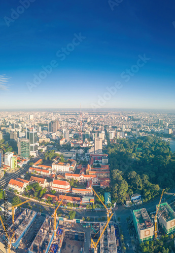© CravenA, Fototapeta premium Aerial panoramic cityscape view of Ho Chi Minh city and Saigon river, Vietnam. Center of heart business at downtown with buildings and towers.