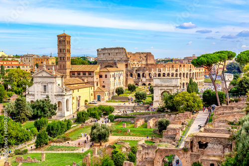 © Nikolay N. Antonov, Fototapeta premium Aerial panoramic cityscape view of the Roman Forum and Roman Colosseum in Rome, Italy. World famous landmarks in Italy during summer sunny day.