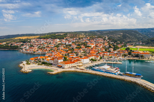 Fototapeta premium Aerial panoramic drone view on village Postira on Brac island, Croatia. August 2020