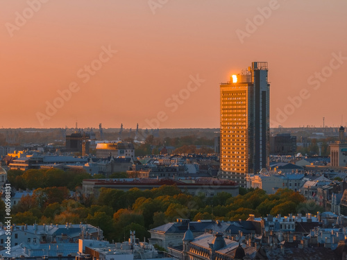Naklejka premium Aerial panoramic sunset over Riga old town in Latvia. Beautiful spring sunset over Riga. Golden hour fire sunset.