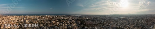 Obraz premium Aerial panoramic view of a sprawling cityscape under a partly cloudy sky.