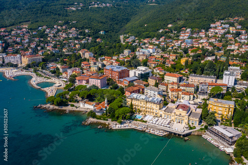 © Mislav, Fototapeta premium Aerial panoramic view of beautiful Town of Opatija and Lungomare sea walkway, Kvarner bay of Croatia