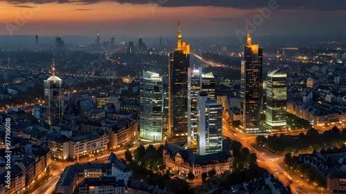 © Adan, Fototapeta premium Aerial panoramic view of Frankfurt, Germany captured at dusk