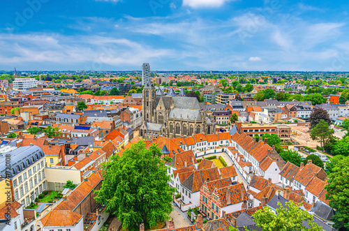 © Aliaksandr, Obraz premium Aerial panoramic view of Kortrijk historical city centre with Roman Catholic Church of Our Lady, Courtrai Begijnhof and red tiled roof buildings, horizon amazing view, West Flanders province, Belgium