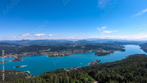 © Chris, Fototapeta premium Aerial panoramic view of Lake Wörthersee seen from Pyramindenkogel in Carinthia, Austria. Serene turquoise waters, lush green forests and rolling hills of Austrian Alps. Charming lakeside village
