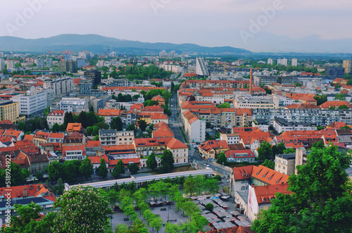 © Oleksandra, Obraz premium Aerial panoramic view of Ljubljana, capital of Slovenia in warm sunset light. Travel destination. Red roofs.