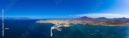 Naklejka premium Aerial panoramic view of Mindelo waterfront in Sao Vicente Island in Cape Verde