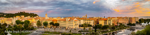 © SvetlanaSF, Fototapeta premium Aerial panoramic view of Old Town Vielle Ville and reflecting fountains on Promenade du Paillon at sunset in Nice France