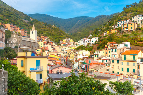 © Kavalenkava, Obraz premium Aerial panoramic view of Riomaggiore fishing village in Five lands, Cinque Terre National Park, Liguria, Italy.
