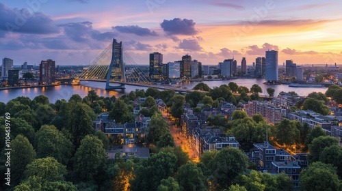 © Wiryo, Obraz premium Aerial panoramic view of Rotterdam city skyline at sunset with a bridge over a river, lush greenery, and illuminated buildings.