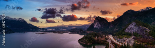 Naklejka premium Aerial Panoramic view of Sea to Sky Highway with Chief Mountain in the background. Colorful Twilight Sky Art Render. Taken near Squamish, North of Vancouver, British Columbia, Canada.