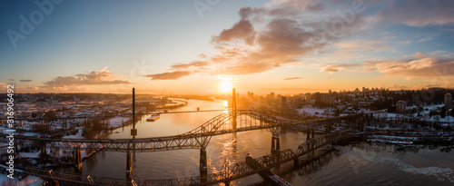 Fototapeta premium Aerial Panoramic View of the Modern City, Bridge and Fraser River during a colorful Sunset. Taken in New Westminster, Vancouver, British Columbia, Canada.
