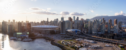 Fototapeta premium Aerial Panoramic View of Vancouver Downtown City Skyline around False Creek during a bright sunset.