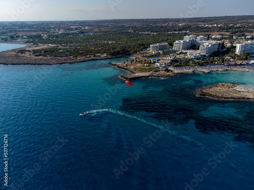© barmalini, Fototapeta premium Aerial panoramic view on blue crystal clear water on Mediterranean sea near Nissi beach, Ayia Napa, Cyprus