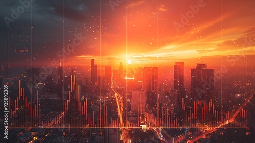 © TranNgoc, Fototapeta premium Aerial perspective of a climate change graph showing temperature growth from 2060 to 2080, detailed annotations for climate milestones, warm and intense color palette,