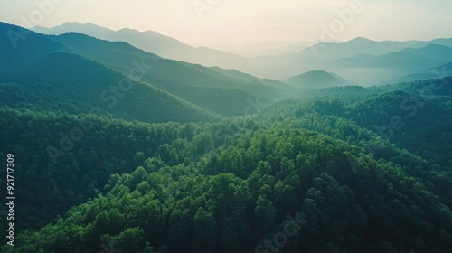 © SETSU ST, Naklejka premium Aerial perspective of a mountain range with a dense forest, clear sky area for text