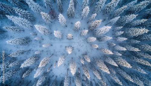 Obraz premium Aerial perspective of a snowy forest, showcasing the larch trees and ski...