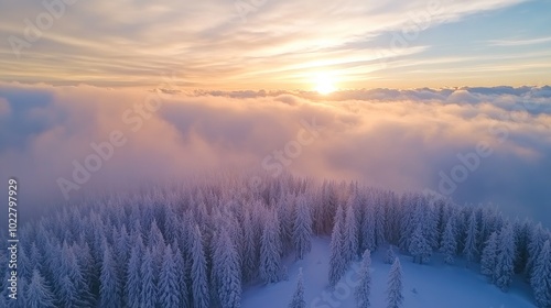 © Kultivad, Fototapeta premium Aerial Perspective of Clouds Above a Forest at Sunset Stunning Winter Scenery