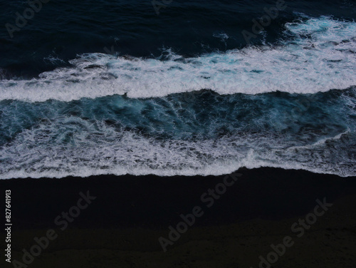 © Anastasiia, Fototapeta premium Aerial photo of a sea water surface. Blue water with foam on waves. Beach with black volcanic sand - view from above. Stylized background abstract texture photo. Tenerife, Puerto de la Cruz