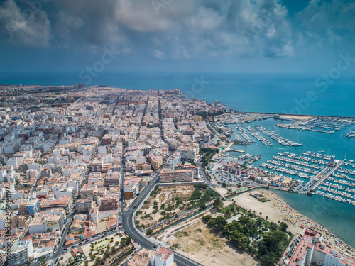 © Alex Kiriuchkov, Fototapeta premium Aerial photo of harbour, residential houses, highways and Mediterranean Sea of Torrevieja. High angle view famous popular travel destinations for travellers. Costa Blanca. Alicante province. Spain 4