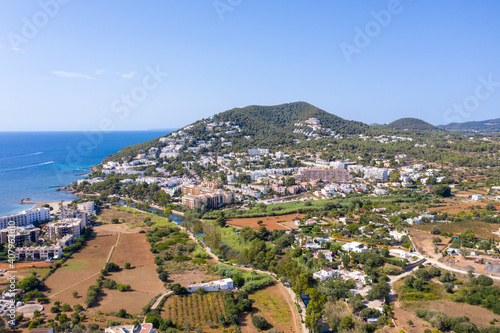 © Duncan, Fototapeta premium Aerial photo of the beautiful island of Ibiza in Spain showing the town centre and hotels on a bright sunny summers day with the mountains in the background