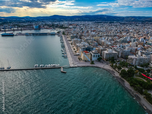 Fototapeta premium Aerial photo over Volos city and the port in Magnesia, Greece