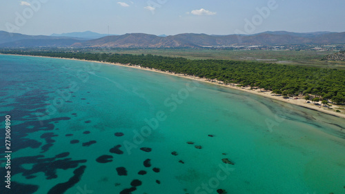Obraz premium Aerial photo taken by drone of caribbean tropical exotic lagoon with turquoise clear sea sandy beach and rare pine trees