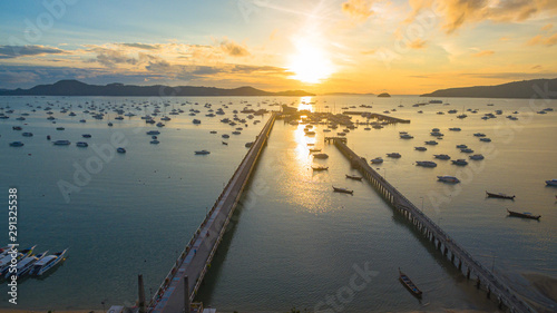 © Narong Niemhom, Naklejka premium aerial photography at Chalong pier. Chalong bay is the most important marina of Phuket there have 2 piers and customs at pier.. Chalong pier transport tourist to travel around islands in Andaman sea