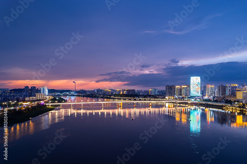 Naklejka premium Aerial photography of the night scene on both sides of the Xiangjiang River in Zhuzhou, China