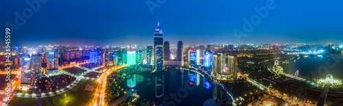 © zhouyilu, Obraz premium Aerial photography of the night view of Didang Lake Central Business District, Shaoxing, Zhejiang