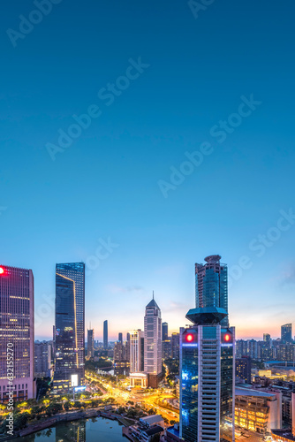 © zhouyilu, Obraz premium ..Aerial photography of the night view of urban architectural landscapes in Wuhan, China..