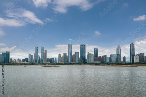 © zhouyilu, Naklejka premium Aerial photography of urban street views on both sides of the Gan River in Nanchang..