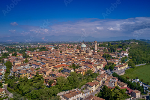 © Berg, Obraz premium Aerial photography with drone. Church Parrocchia della Nativita di San Giovanni Battista on the mountain in the city of Lonato, Italy