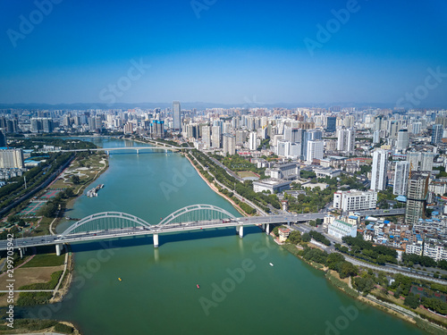 © Steve, Fototapeta premium Aerial photos of high-rise residential area along the river and bridge across the river in the city