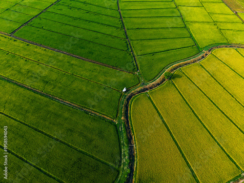 © Parilov, Naklejka premium Aerial rice paddies surrounding curved drainage canal fields