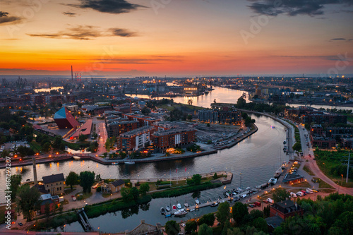 Obraz premium Aerial scenery of Gdansk with the mouth of the Motlawa River at sunset. Poland