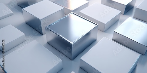 © kwanchaift, Obraz premium Aerial shot (drone) of clean, multiple, simple geometric blocks/shapes laid out on a table (abstract spatial design/composition concept), abstract pattern, composition, c