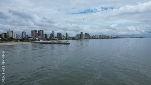 © Raje Photos Stock, Naklejka premium Aerial shot of a long pier jutting into a calm, gray sea under a cloudy sky. Unidentifiable people stand at the end, with distant islands on the horizon. Peaceful, minimalist coastal scene.
