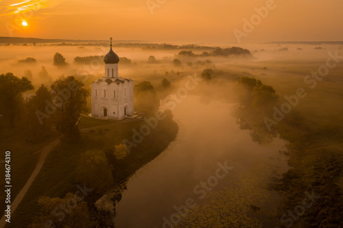 © Igor, Fototapeta premium Aerial shot of a Russian Orthodox church above a misty field lit by the rising sun. A pond near the church, a river in the background. No people.