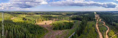 © nikwaller, Naklejka premium Aerial shot of forest and deforestation over the hills with trees chopped down. Aerial panorama.