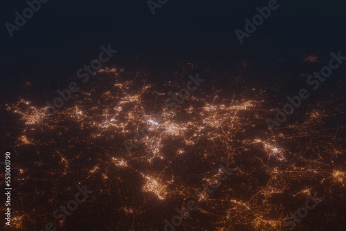 Naklejka premium Aerial shot of Katowice (Poland) at night, view from south. Imitation of satellite view on modern city with street lights and glow effect. 3d render