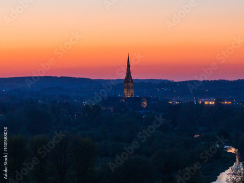 © Lightning Strike Pro, Fototapeta premium Aerial shot of Salisbury Cathedral at sunset