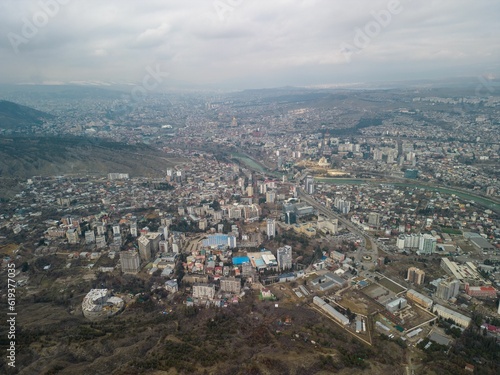 Fototapeta premium Aerial shot of the cityscape of Tbilisi, Georgia with buildings against a clouded sky