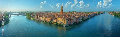 © Антон Сальников, Naklejka premium Aerial shot of the Rhine at sunrise, featuring the Theodor-Heuss bridge from the Mainz Rhine bank