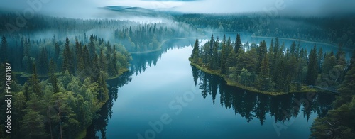 Fototapeta premium Aerial shot of the serene lakes and forests in the Finnish Lapland, with the...