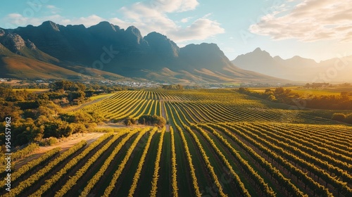 © P.G, Fototapeta premium Aerial shot of the vibrant vineyards in Stellenbosch, with neat rows of grapevines and surrounding mountains