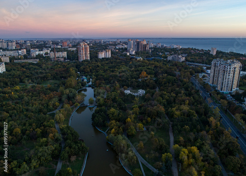 Fototapeta premium Aerial shot of Victory Park in Odessa at sunsrise