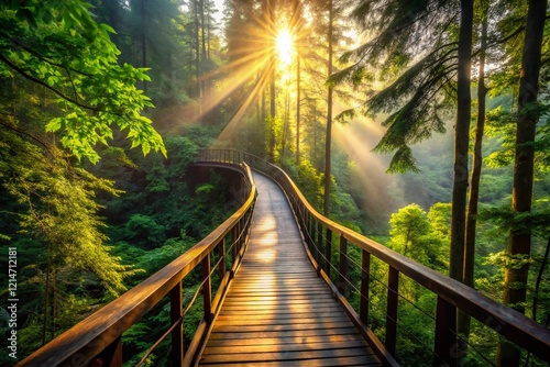 © Four888, Obraz premium Aerial Silhouette: Wooden Bridge Walkway Through Lush Forest Canopy
