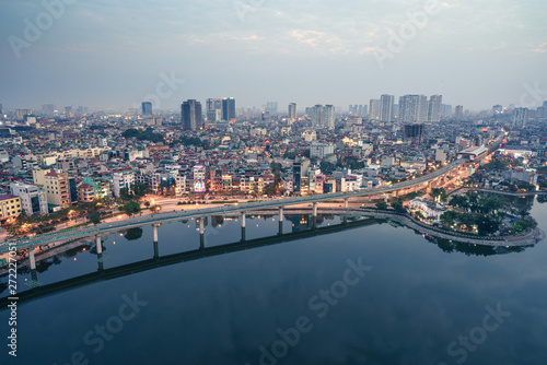 © Hanoi Photography, Obraz premium Aerial skyline view of Hanoi city, Vietnam. Hanoi cityscape by sunset period at Hoang Cau lake, Dong Da district
